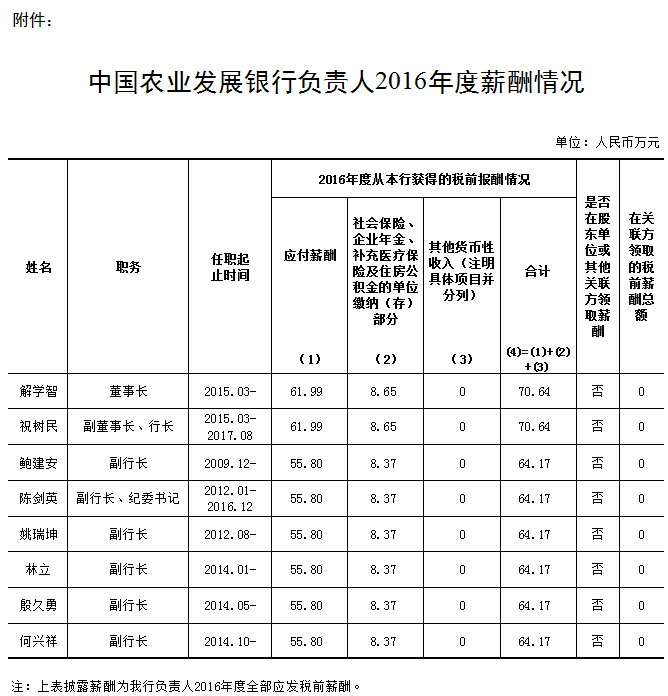 自2015年1月起,中國農業發展銀行董事長、行長及其他副職負責人的薪酬,按照國家關于中央管理企業負責人薪酬制度改革的意見執行。根據國家有關規定,現公開披露中國農業發展銀行負責人2016年度薪酬。