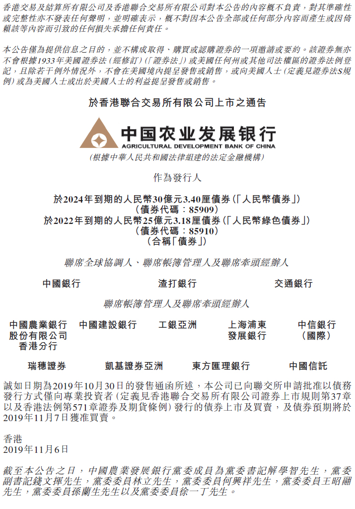 于香港聯合交易所有限公司上市的公告