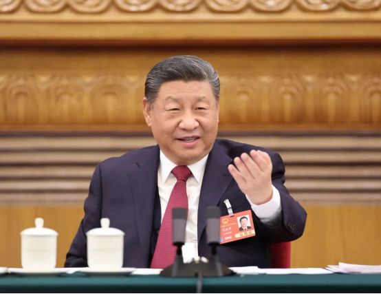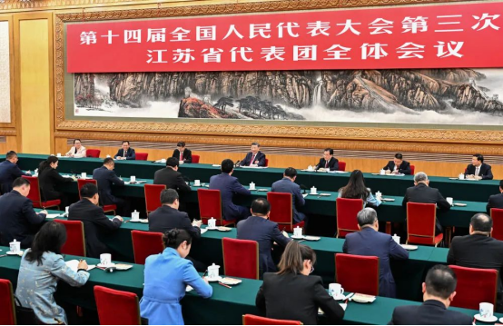 3月5日下午,中共中央總書記、國家主席、中央軍委主席習近平參加他所在的十四屆全國人大三次會議江蘇代表團審議。新華社發(盛佳鵬 攝)