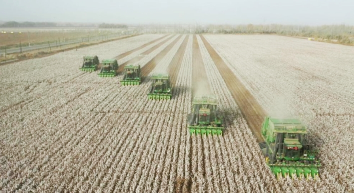 ▲巴州尉犁縣高標準棉田機械化收割場景