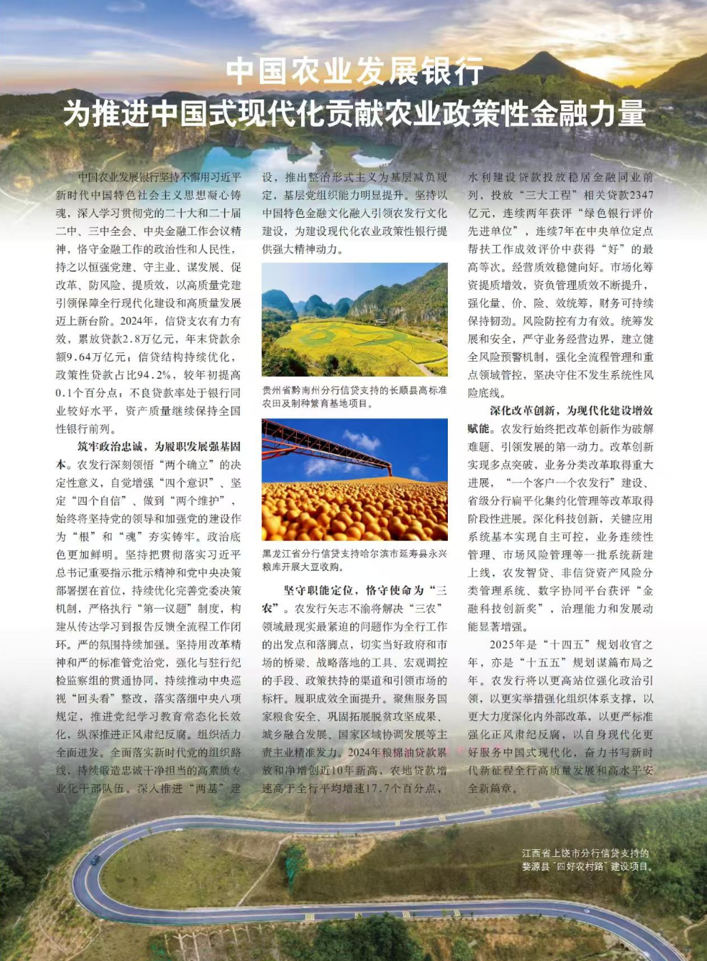 中國農業發展銀行堅持不懈用習近平新時代中國特色社會主義思想凝心鑄魂,深入學習貫徹黨的二十大和二十屆二中、三中全會、中央金融工作會議精神,恪守金融工作的政治性和人民性,持之以恒強黨建、守主業、謀發展、促改革、防風險、提質效,以高質量黨建引領保障全行現代化建設和高質量發展邁上新臺階。2024年,信貸支農有力有效,累放貸款2.8萬億元,年末貸款余額9.64萬億元;信貸結構持續優化,政策性貸款占比94.2%,較年初提高0.1個百分點;不良貸款率處于銀行同業較好水平,資產質量繼續保持全國性銀行前列。