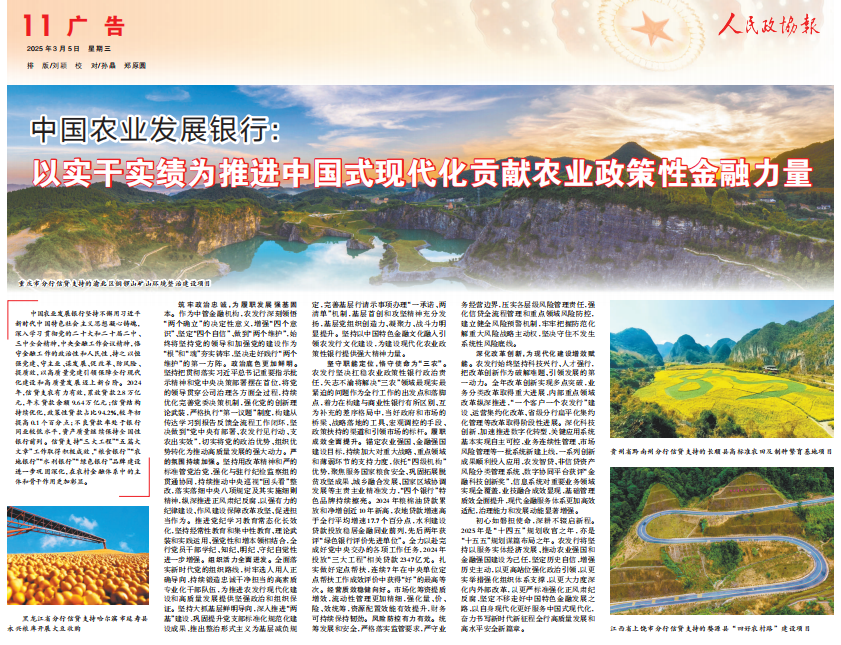 初心如磐擔使命,深耕不輟啟新程。2025年是“十四五”規劃收官之年,亦是“十五五”規劃謀篇布局之年。農發行將堅持以服務實體經濟發展、推動農業強國和金融強國建設為己任,堅定歷史自信,增強歷史主動,以更高站位強化政治引領,以更實舉措強化組織體系支撐,以更大力度深化內外部改革,以更嚴標準強化正風肅紀反腐,堅定不移走好中國特色金融發展之路,以自身現代化更好服務中國式現代化,奮力書寫新時代新征程全行高質量發展和高水平安全新篇章。